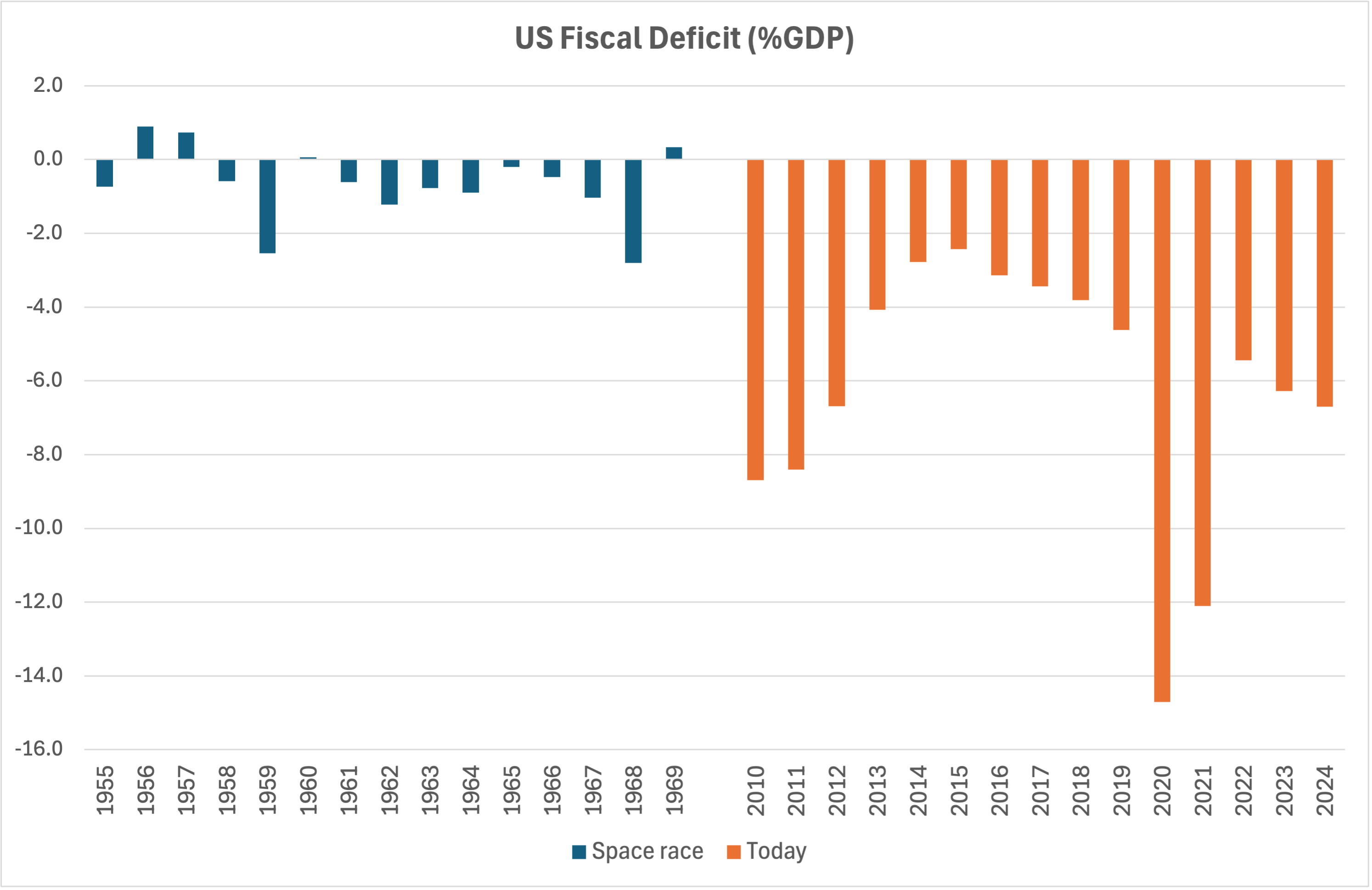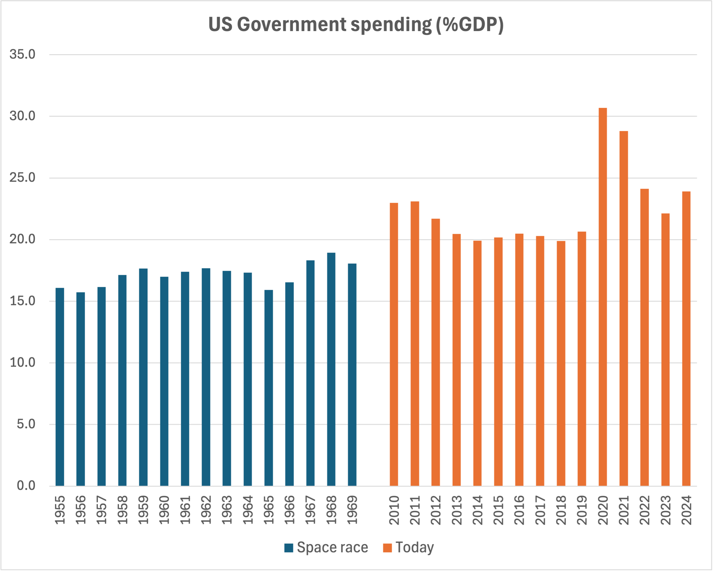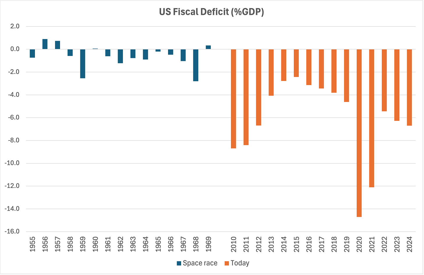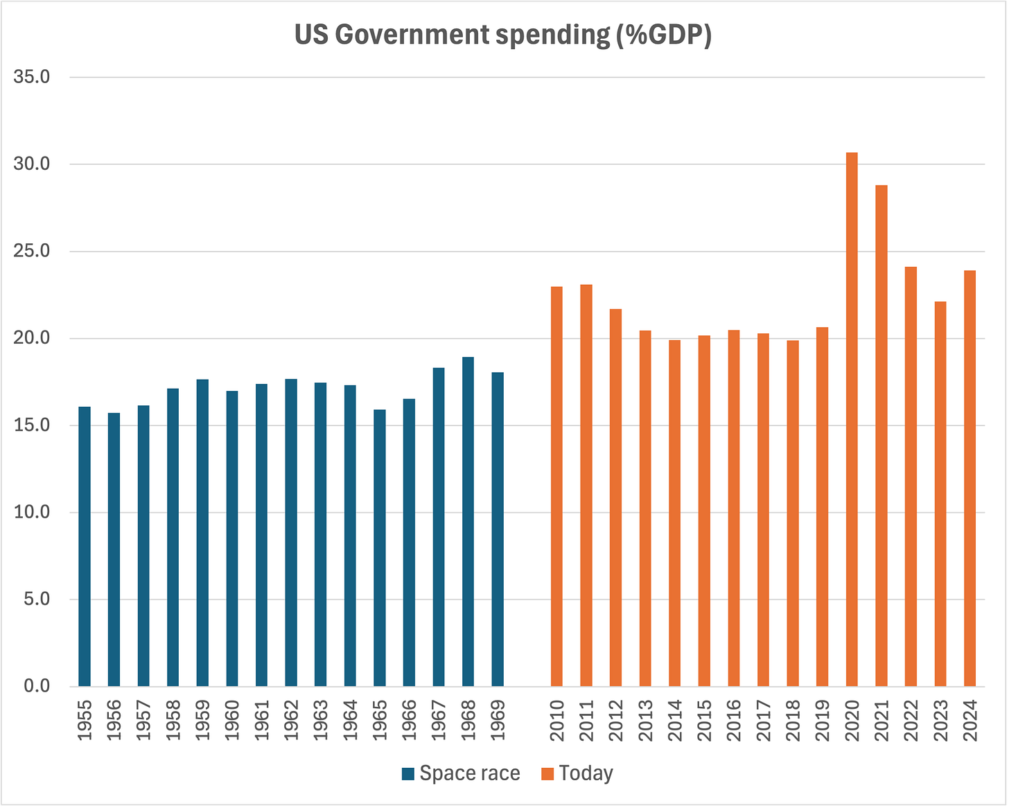 During the space race (1955-69), the US government’s deficit averaged just two-thirds of one percent of GDP per year; since 2010 it has averaged over 6% of GDP. We’re overspending and borrowing 10 times more, as a share of the economy. And yes, that’s right: we went to the moon on a balanced budget.