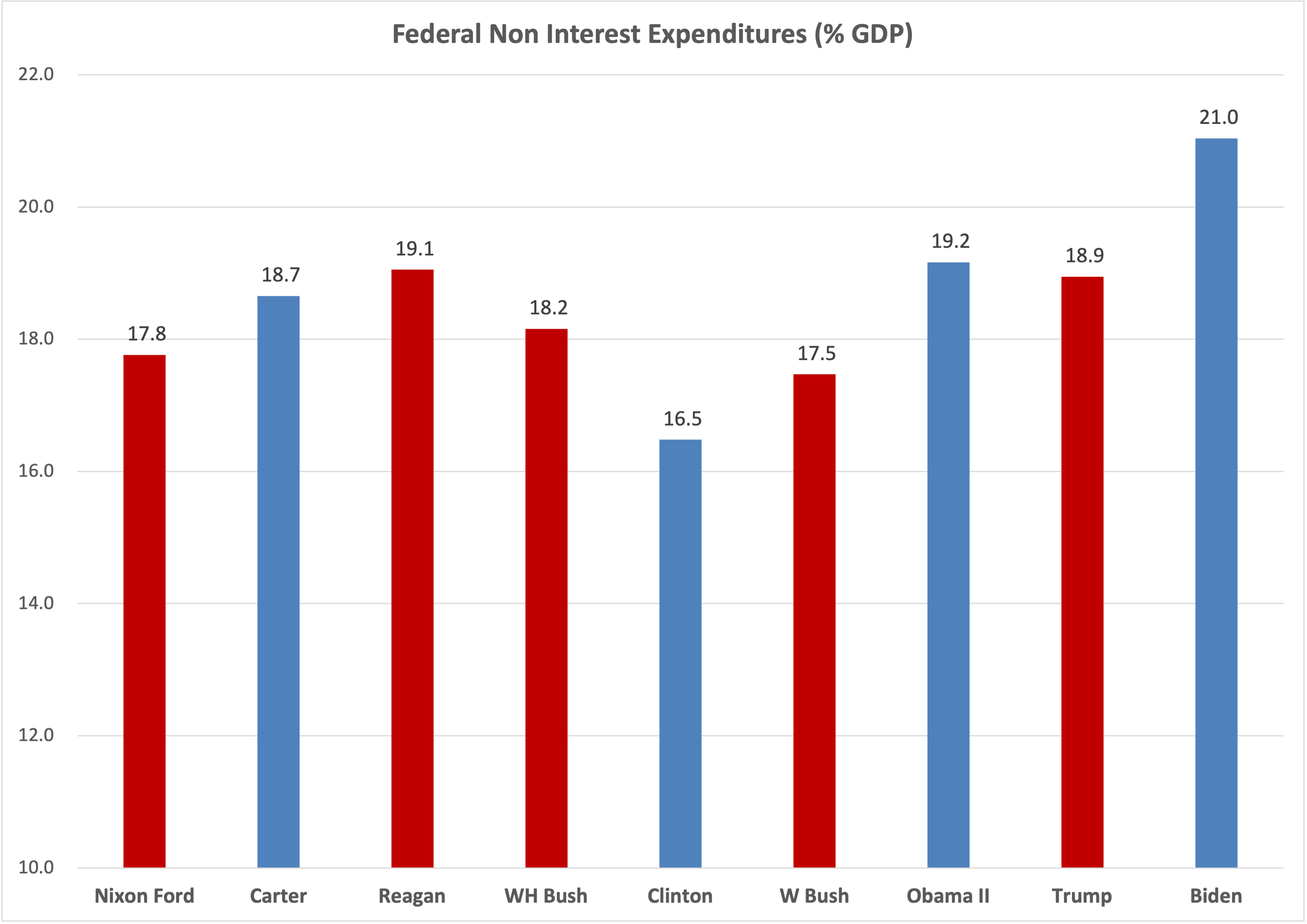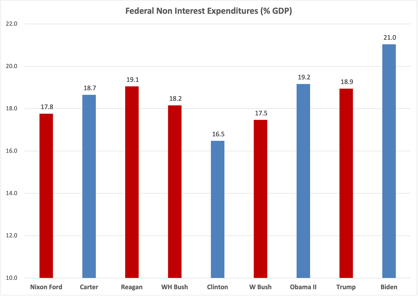 non-interest expenditures today are a full 5% of GDP higher than they were when Clinton left office — an over 30% increase.