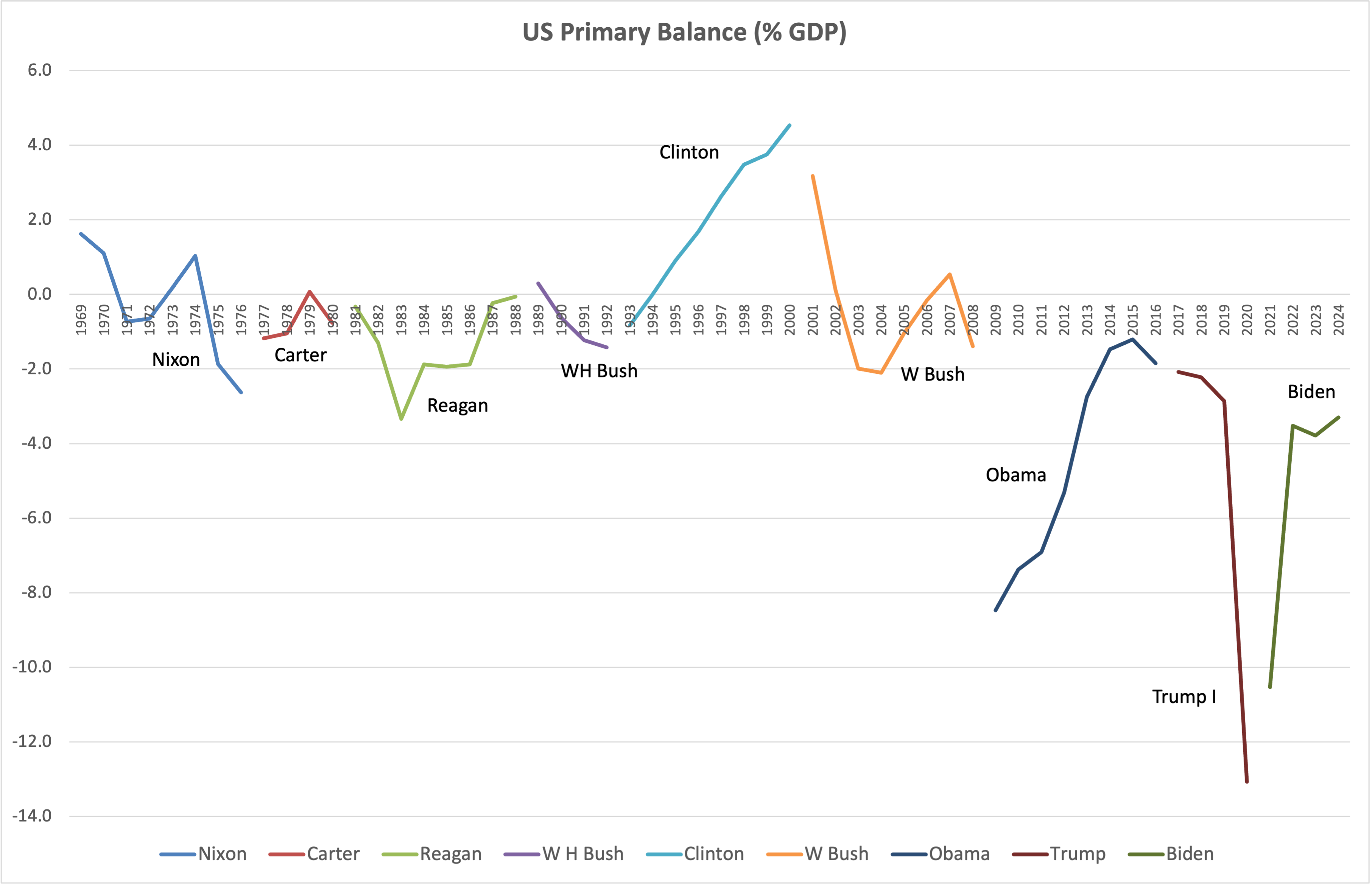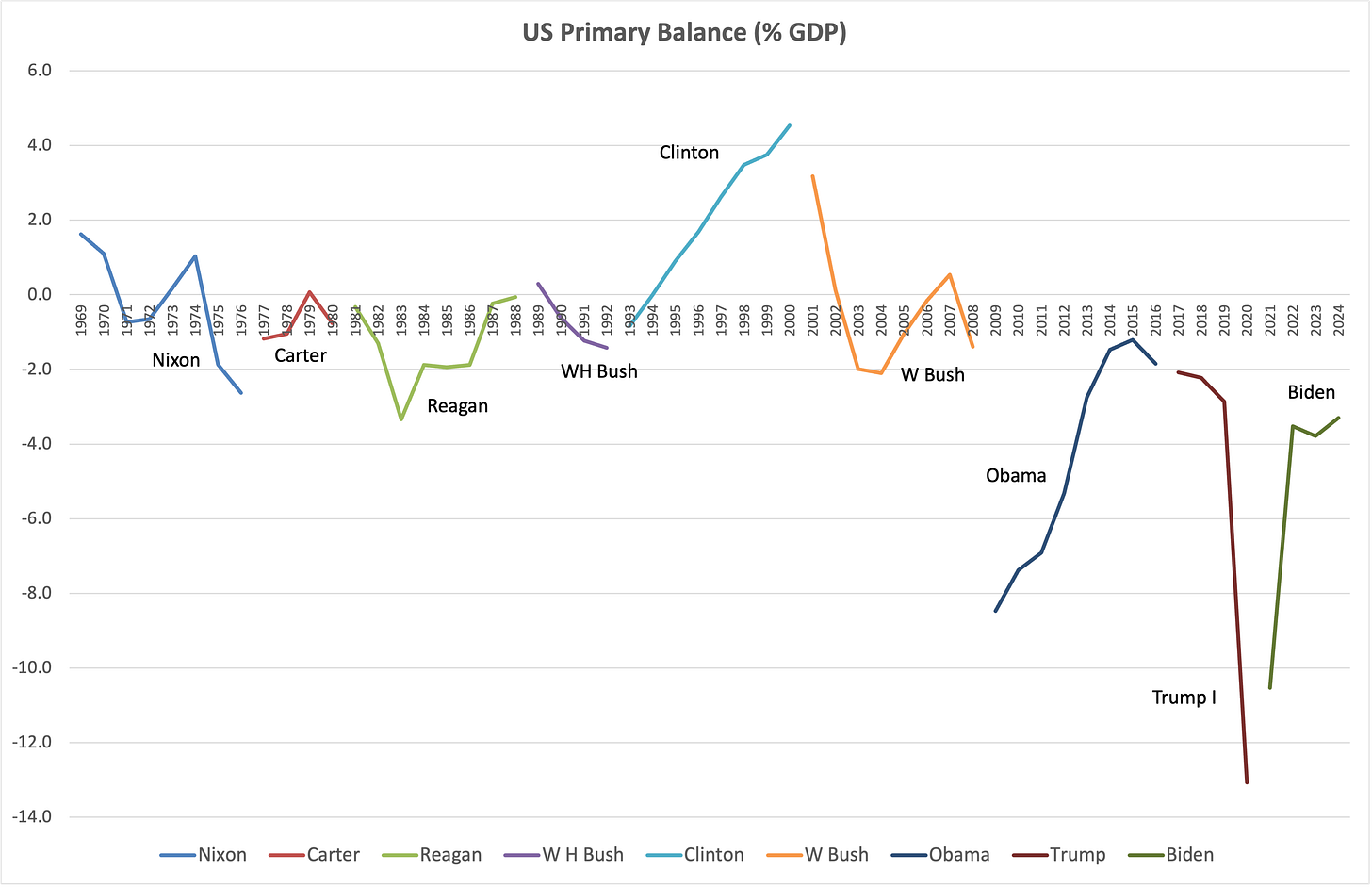 I want to spend a few words in defense of Reagan. Under his watch, the deficit widened by 3pp during 1982-83. Of this, 1pp was the rise in defense spending that proved instrumental in winning the Cold War. Interest spending rose by over 1pp during his tenure, courtesy of the fight against high inflation (remember Paul Volcker?) which also caused a deep recession in 1982. And then of course there were the tax cuts, which helped revive economic growth. But Reagan did reduce the deficit over the last five years of his tenure, and in his last two years the primary balance was close to zero, significantly stronger than what he inherited from Carter (-0.8%). So if the benchmark is a multi-year fiscal consolidation that left the government accounts in a stronger shape than they were found, I will submit to you that Reagan also fits the bill.