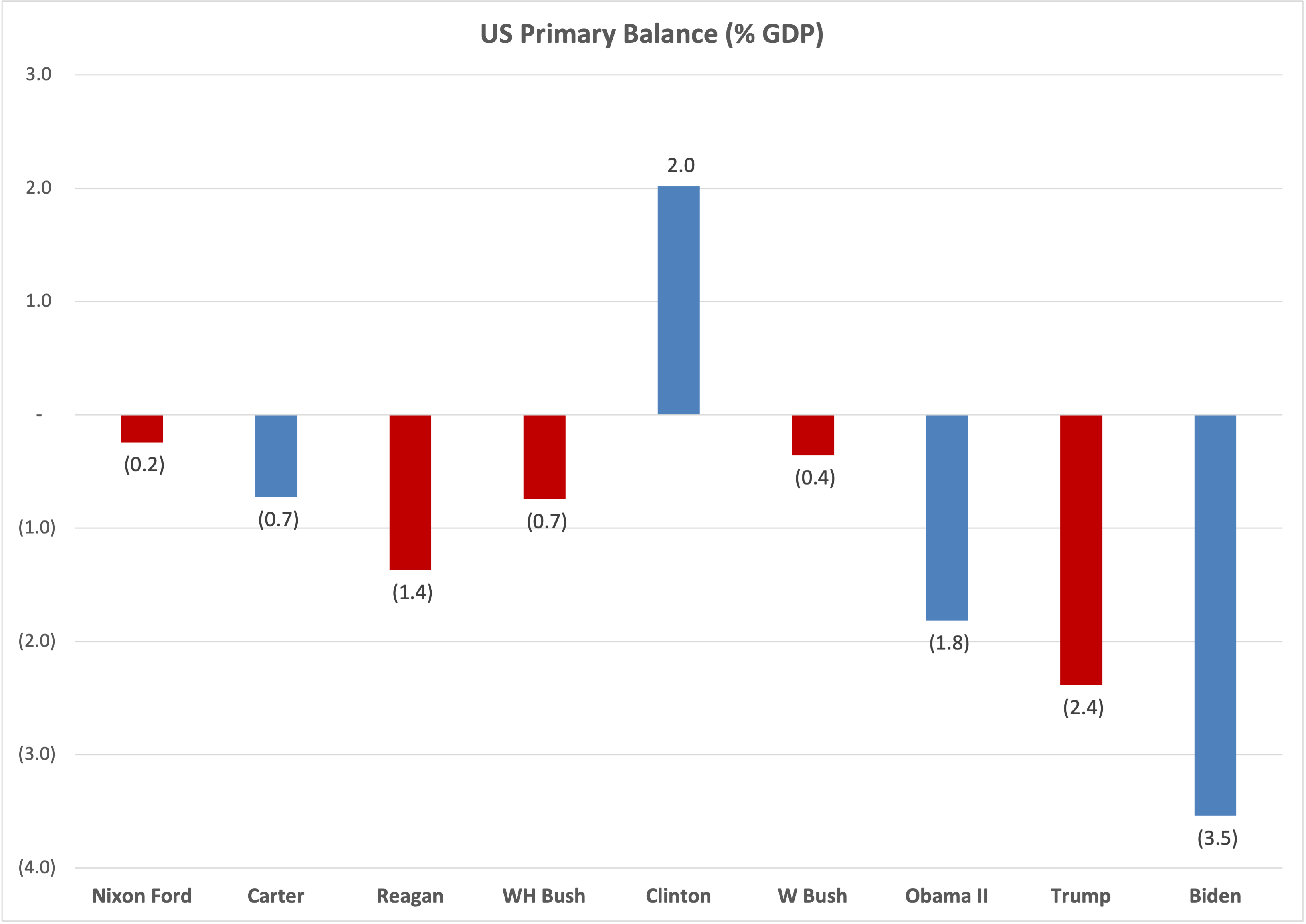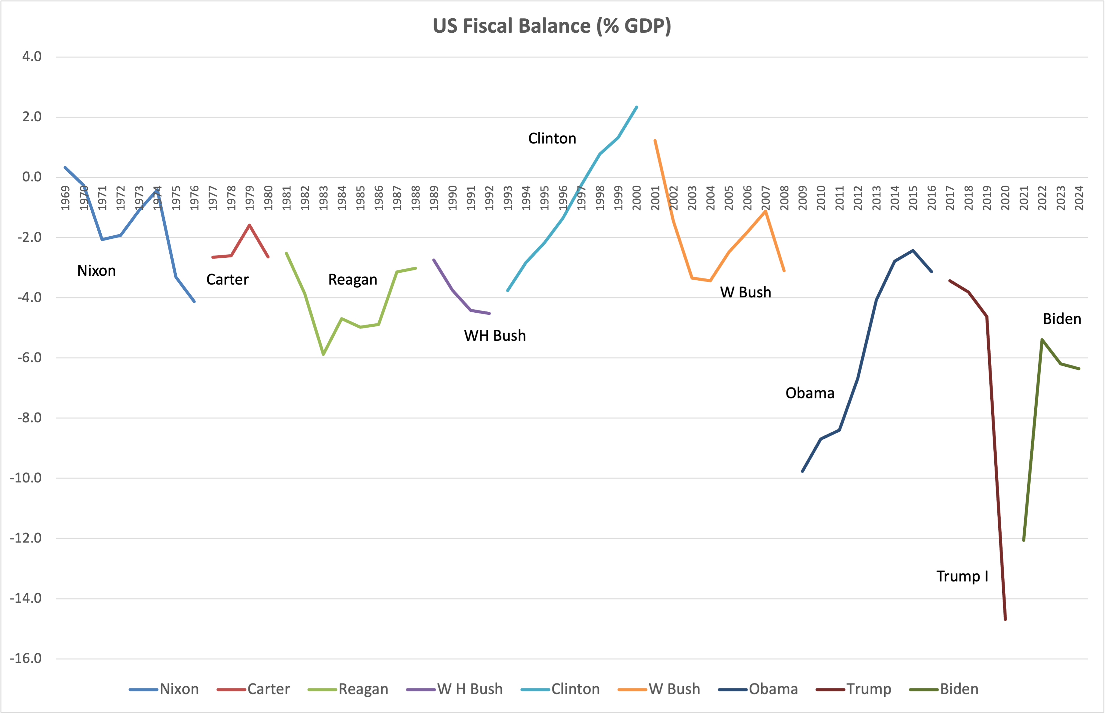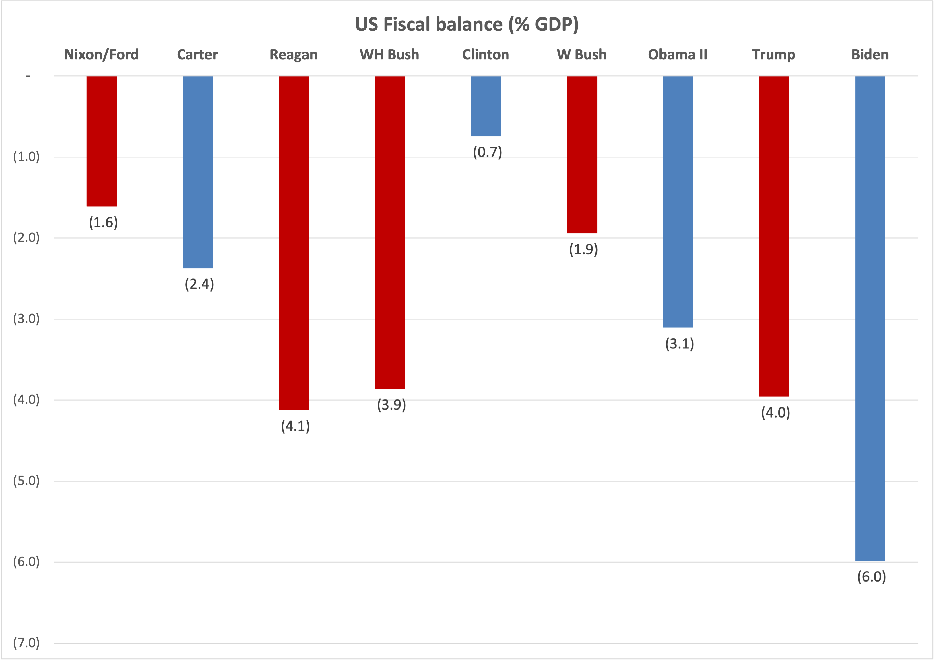 What’s the right way to assess an administration’s fiscal prudence? In first approximation, for me it’s the average fiscal balance over its tenure. It tells us to what extent the government has been living beyond its means, borrowing and adding to the debt. The chart below shows the average balance under the last nine administrations, starting with Nixon/Ford and ending with Biden.