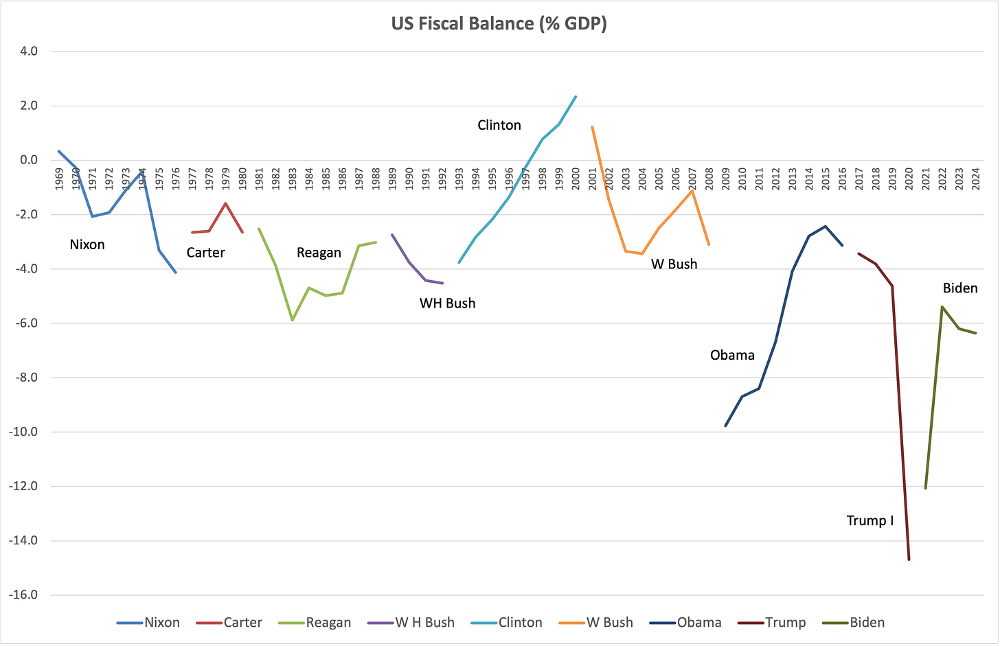 The Global Financial Crisis and the Covid shutdowns triggered massive fiscal expansions, and it would be unfair to let those skew the picture. Therefore, I am leaving out Obama’s first term, dominated by the giant fiscal stimulus deployed to cushion the GFC blow (with an average fiscal deficit of 8.4% of GDP); I am also leaving out the last year of Trump I, and the first year of Biden, with a cumulative deficit of 27% of GDP.