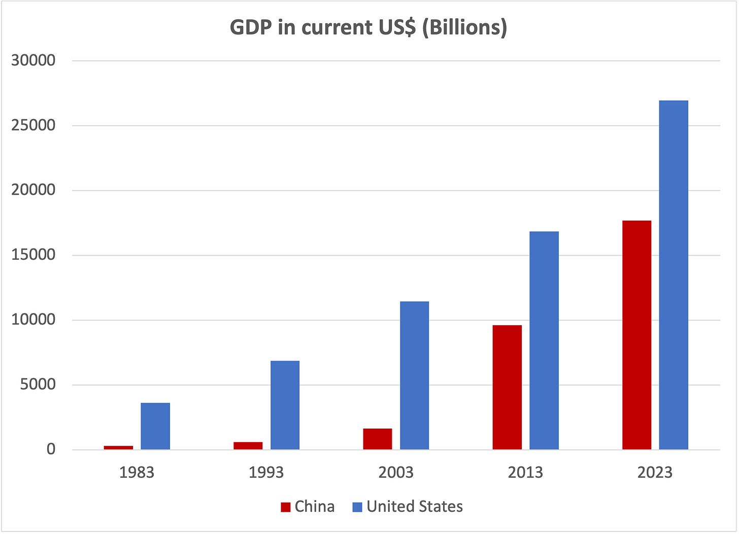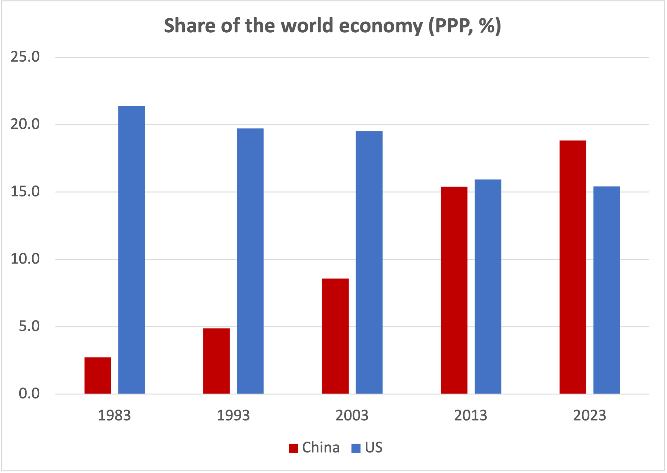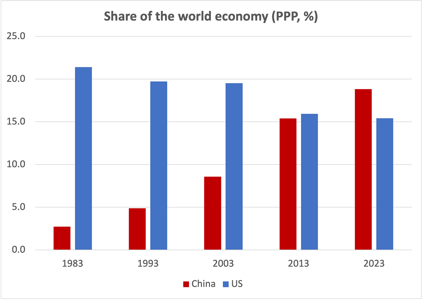 China spearheads an open challenge to the western view of the world and to the dominance of western economies and institutions. Its ambition is to replace the US as the preeminent economic and geopolitical superpower. Through a massive rapid expansion of its economy over the past decades, China has gained enormous economic influence across the world, on both emerging and developed economies. In purchasing power parity (adjusting for lower prices in China than in the US), China’s share of the world economy has already surpassed the US’s: