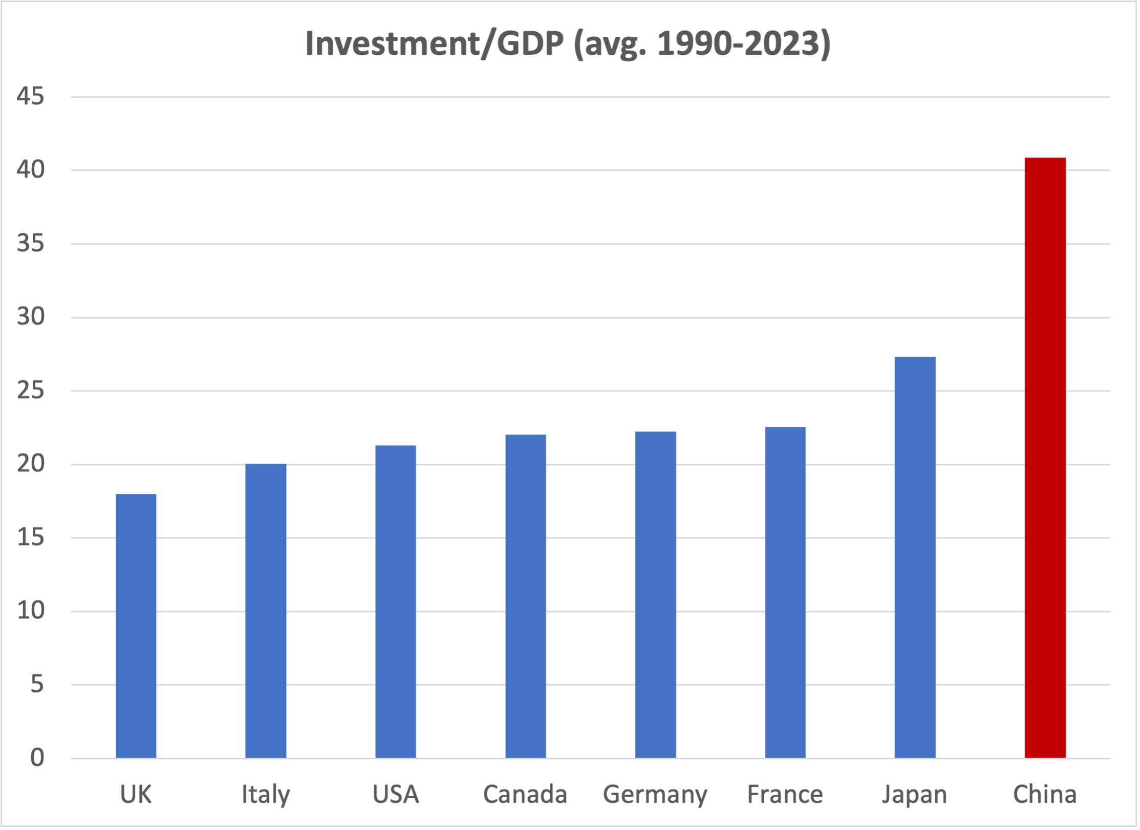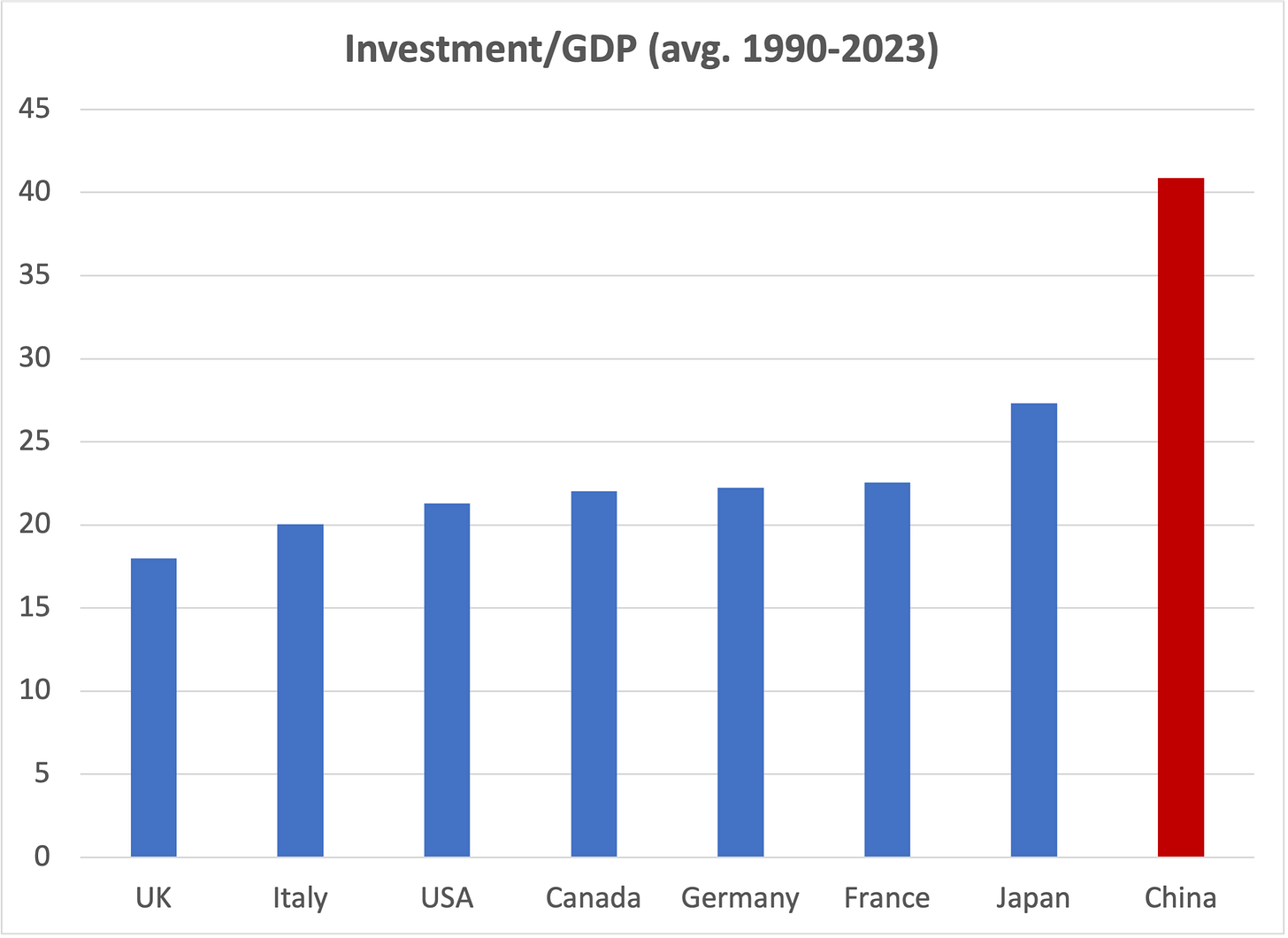 Second: Even before this political shift, China’s growth strategy was unsustainable. For too long it has relied mostly on investment and construction, while household consumption remains hamstrung by the lack of a social safety net. Michael Pettis, senior fellow at Carnegie China, made this point very cogently in a recent Financial Times article, where he notes that investment has accounted for about 40% of China’s GDP over the last thirty years; by comparison, as I show in the chart below, since 1990 investment has averaged just over 20% of GDP in most G7 countries (a bit less in the UK, and Japan’s the outlier with 27%). The share of investment in global GDP is about one-quarter, with consumption accounting for three quarters. Pettis underlines that while China accounts for less than one-fifth of the global economy, it already carries out one third of total global investment.