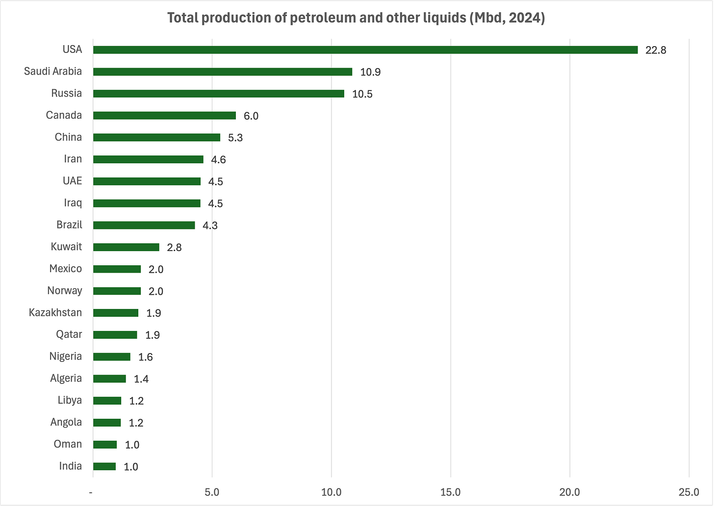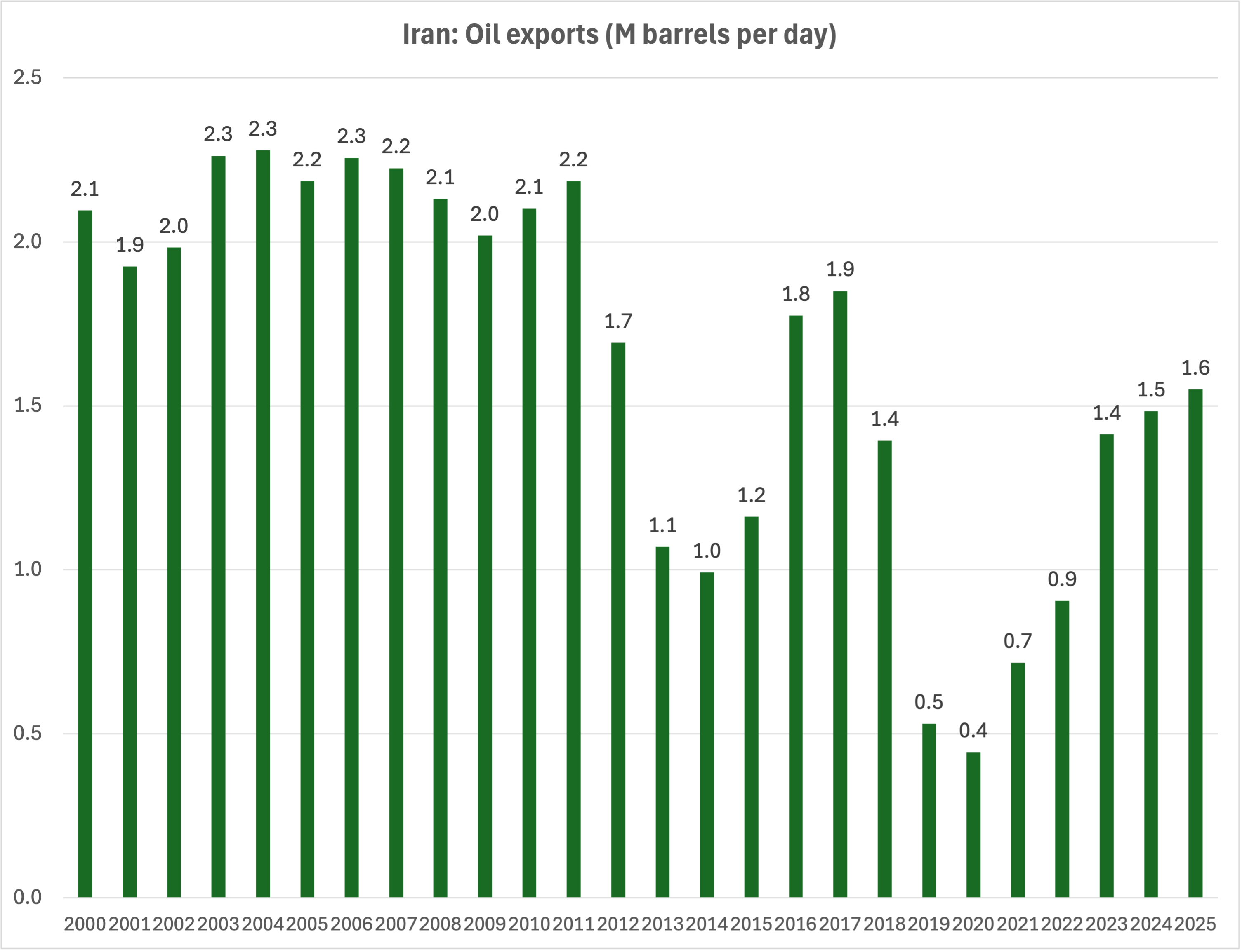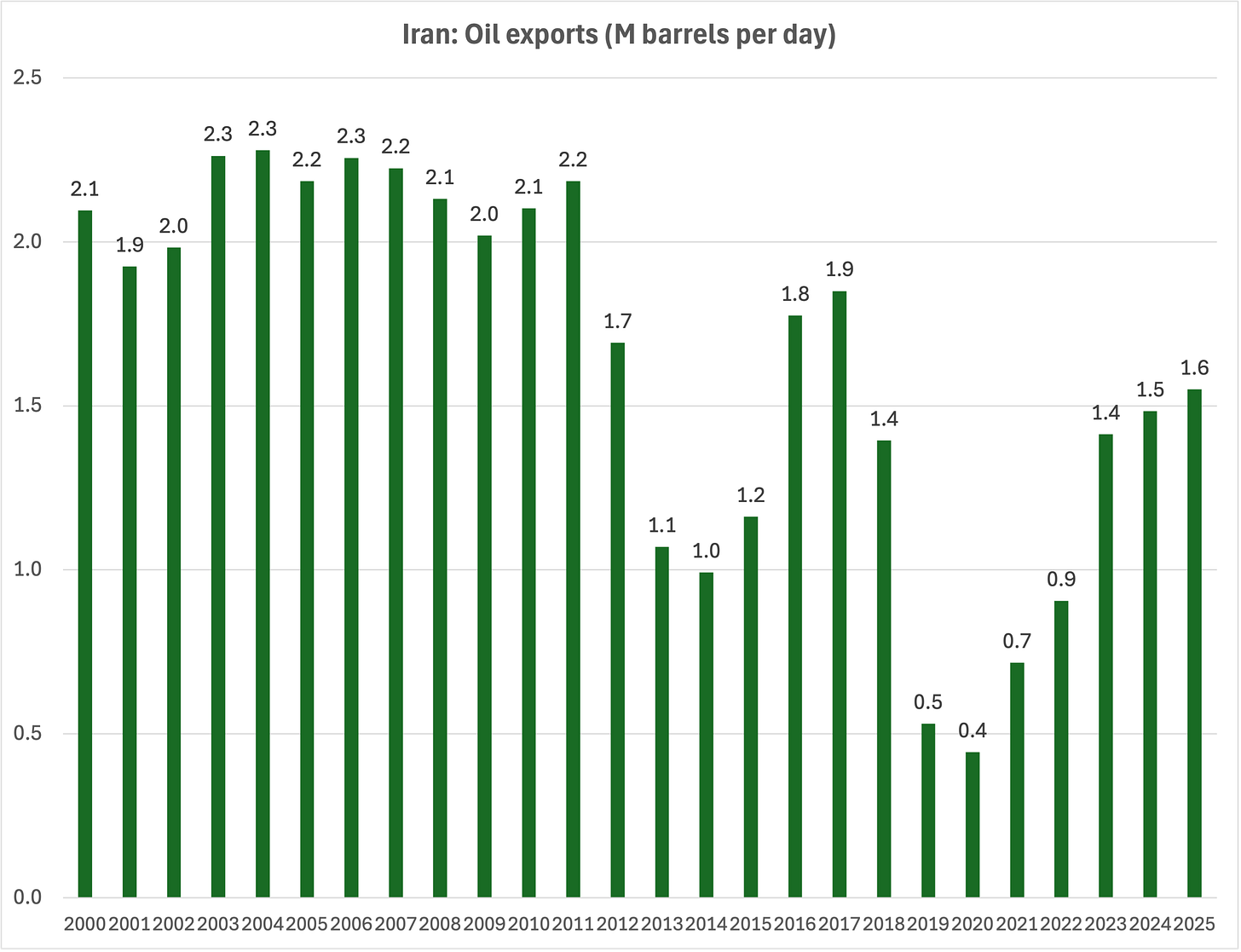 Iran’s oil exports are a more interesting story. At 1.6 Mbpd, they are not too far below their 2.2-2.3 M peak of the mid-2000s, and a lot higher than the 400k level of 2020, when sanctions were biting hard (compounded by the Covid slowdown). The export rebound of the last few years reflects largely demand from China, which now buys 80%-90% of Iran’s oil, enjoying close to a $10 per barrel discount compared to market prices. To put things in perspective, China consumes over 16 million barrels a day compared to a domestic production of just over 5 million. The US produces close to 23 million and consumes over 20 million (2024 data, EIA).