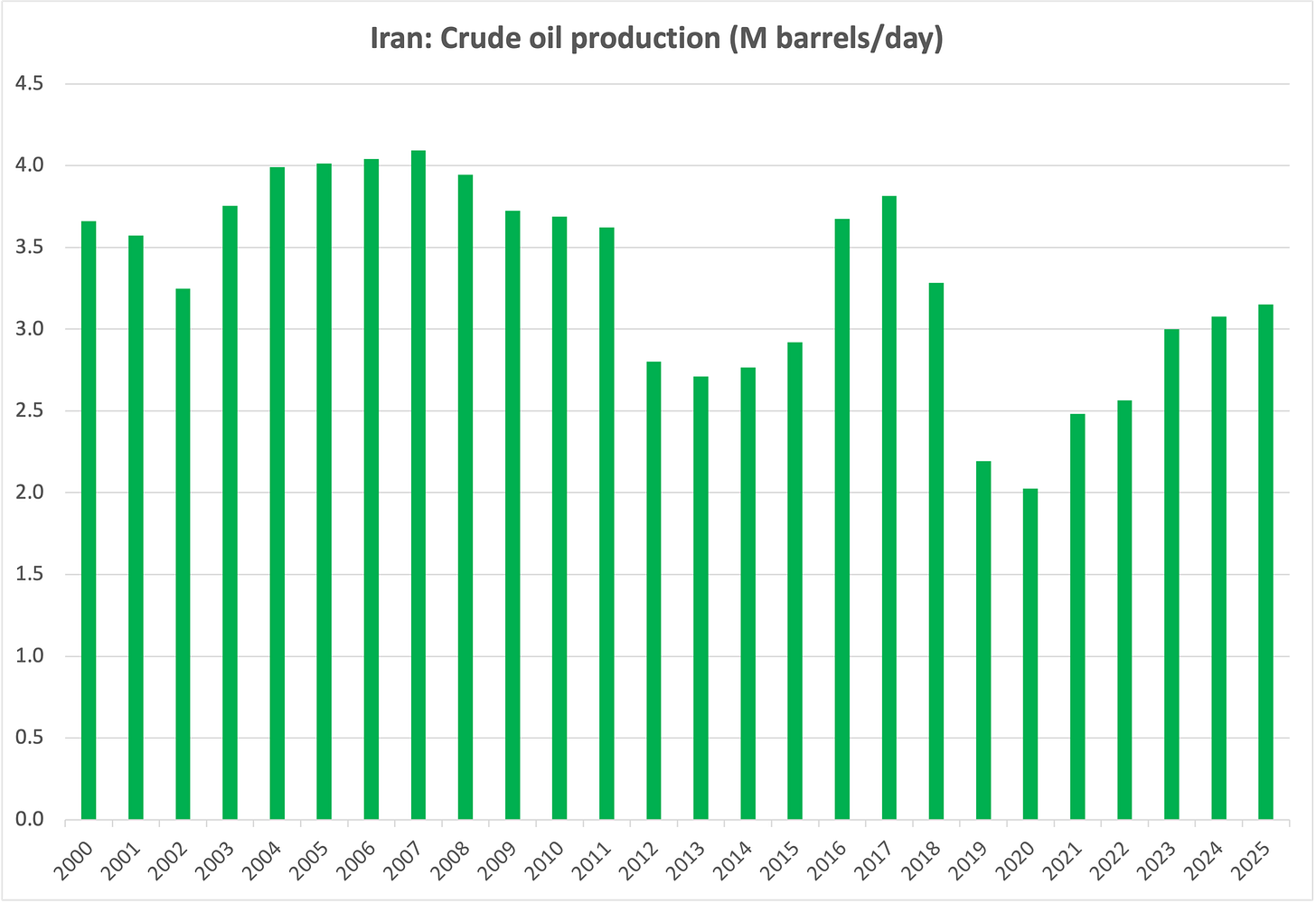 Iran now produces some 3 Mbpd, about 1 million below the peak of the mid-2000s, and 1 million above the nadir of 2020. (Venezuela around 800-900k).