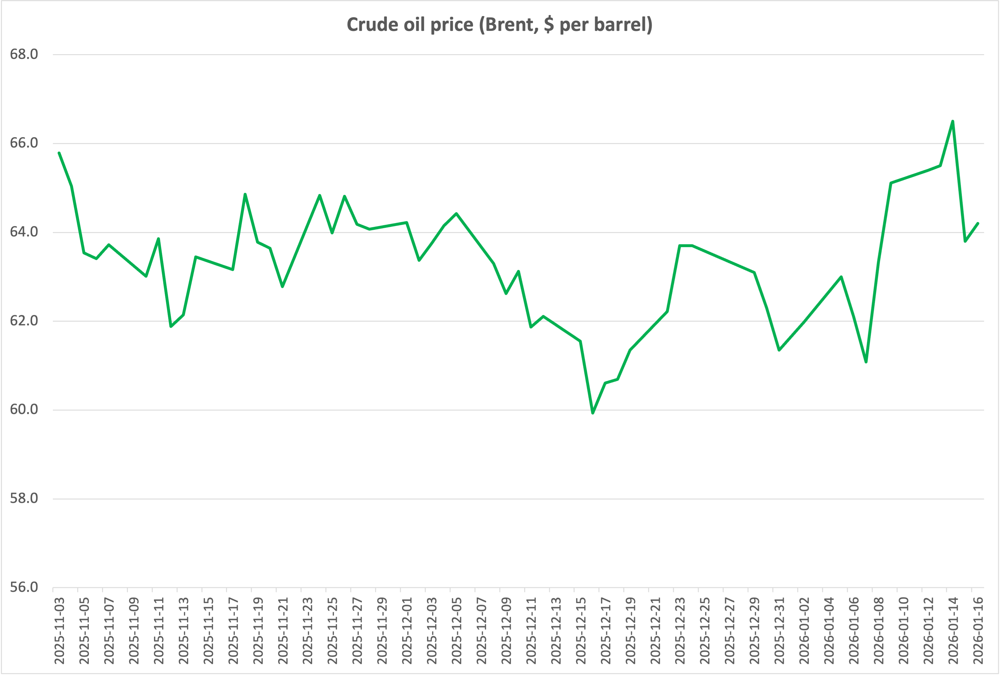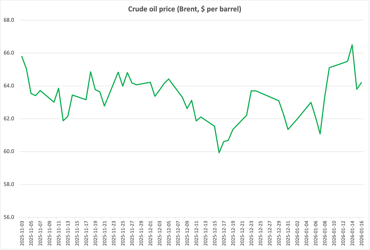Brent oil prices briefly spiked to over $66 per barrel, about $2 above the prevailing level in December before the protests started, and $5 above the early-January low. We’re now back at December levels.