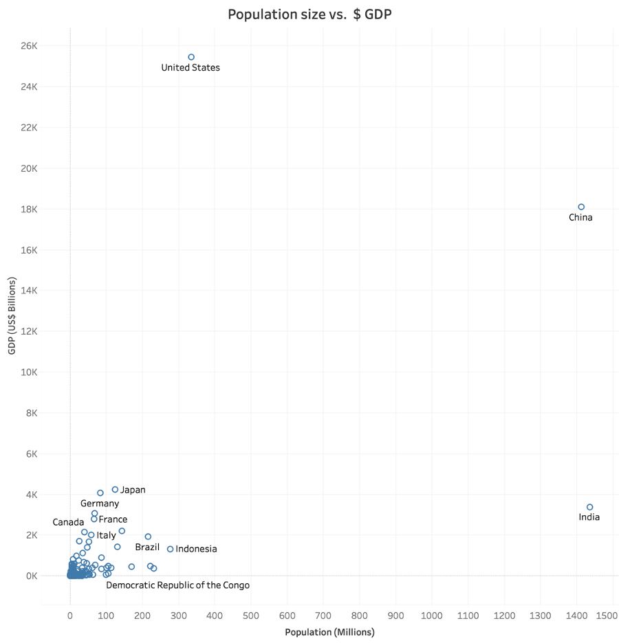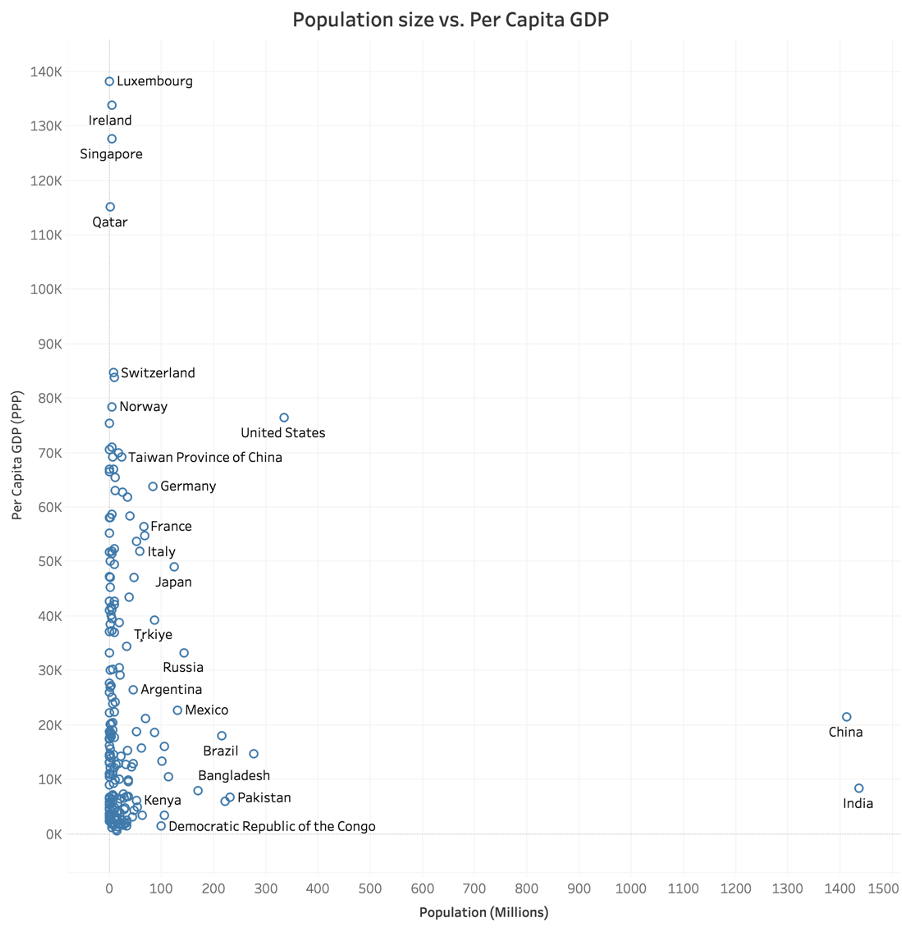 Let’s start with the obvious: a larger population is no guarantee of higher living standards. The chart below plots population size versus per capita GDP (2022, in Purchasing Power Parity ) for all countries in the IMF database. India and China skew the picture, but what immediately jumps out is that the largest countries are very poor while the richest countries are very small.