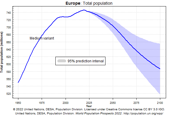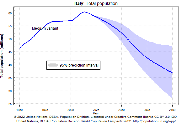 Italy’s population is projected to shrink by over a third, from 60 million people to less than 40 by the end of this century. Europe’s entire population is projected to shrink by 150 million people, or about one-fifth.