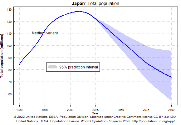 Over the same time horizon, Japan’s population could fall to nearly one half of its current level.