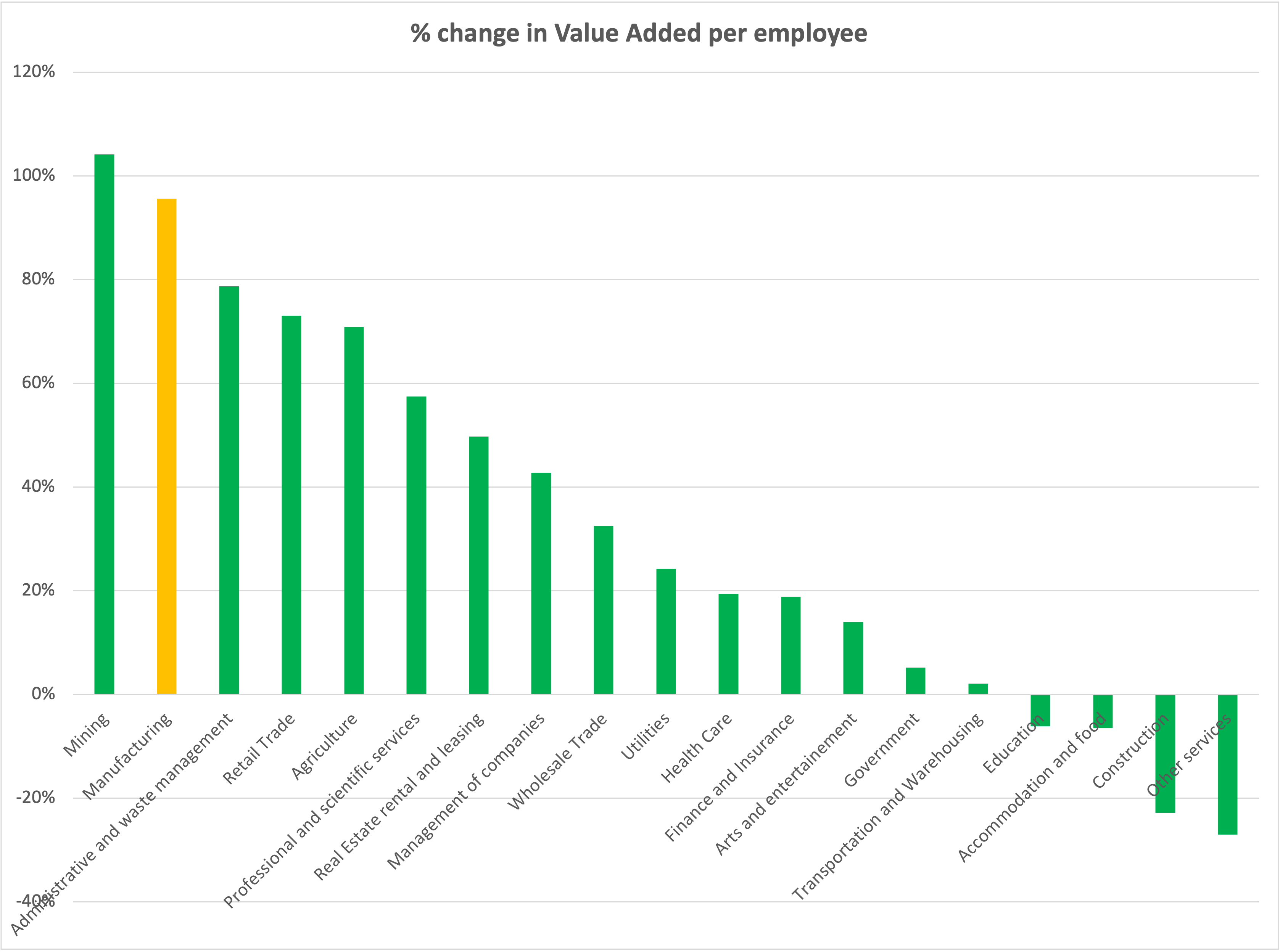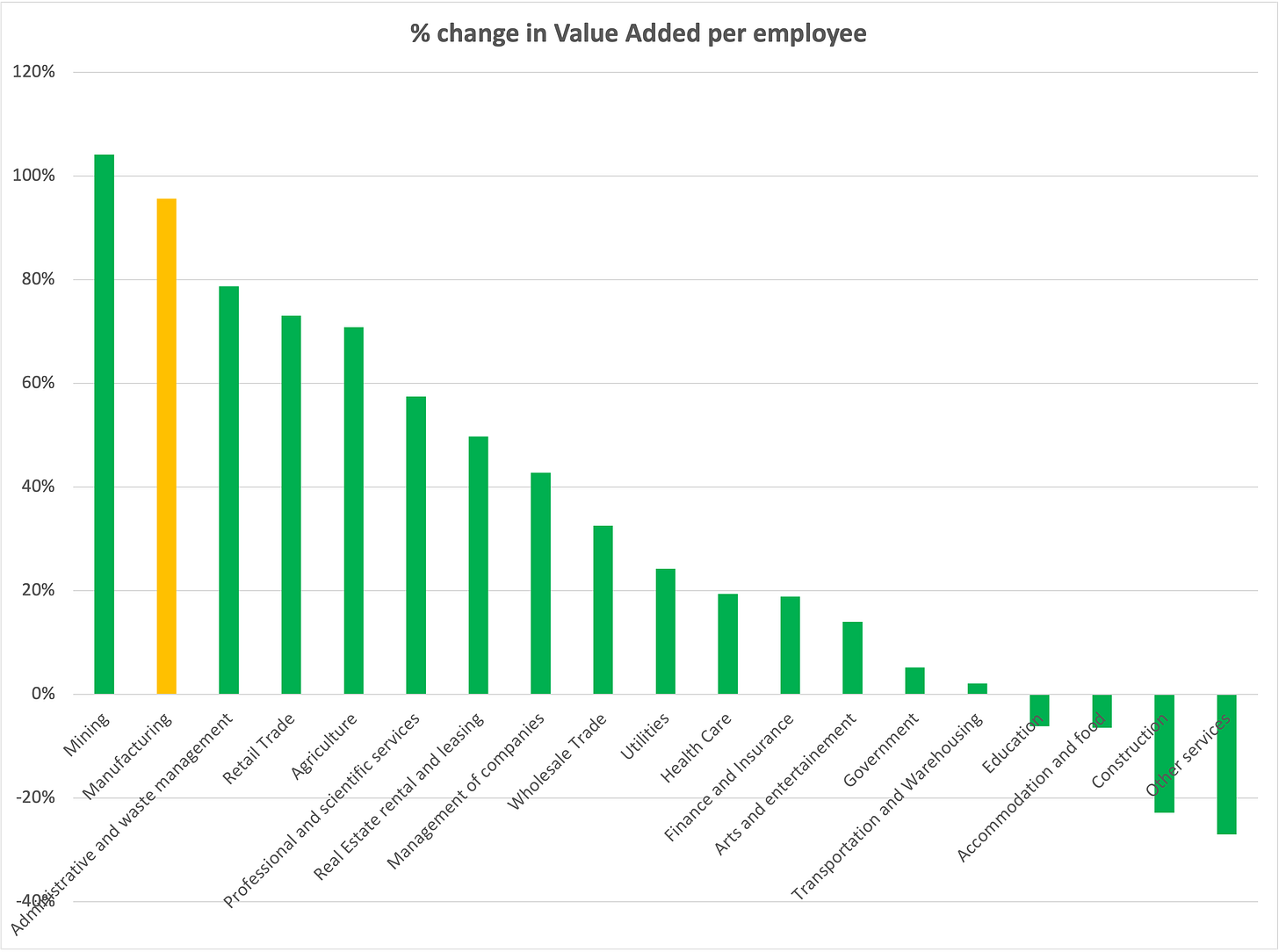 A traditional, sure-fire way to raise labor productivity is to raise the capital/labor ratio. In other words, substitute labor with capital. It works, but doesn’t help much if our goal is to raise living standards for the majority of the population. The most dramatic examples of capital/labor substitution are in agriculture and mining. As I showed in a chart, reproduced below, mining enjoyed the strongest rise in real value added per employee since 2000; agriculture was not far behind.